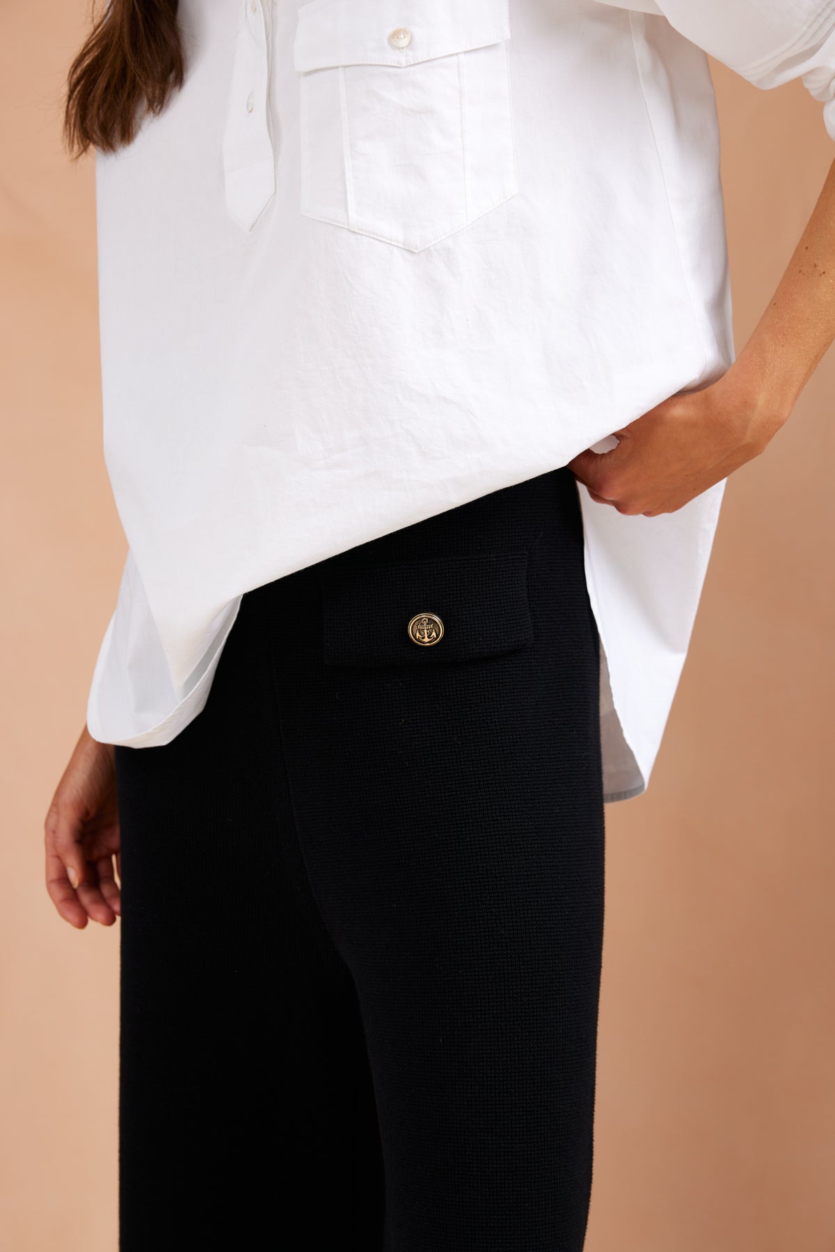 Brisk. Both in weather & current mood. We are all about pants. Bringing ease & elegance & practicality in equal measure. Crafted from structured yet soft cotton Milano knit in a deep midnight blue, they fall to a full-length, wide-leg silhouette that moves effortlessly. Brass military buttons add a refined touch, keeping things sharp but understated. Relaxed yet polished, they’re the kind of trousers that work just as well for stepping out as they do for slowing down. Pair back with our Port Fairy shirt or Split Point knit blazer for relaxed suiting.